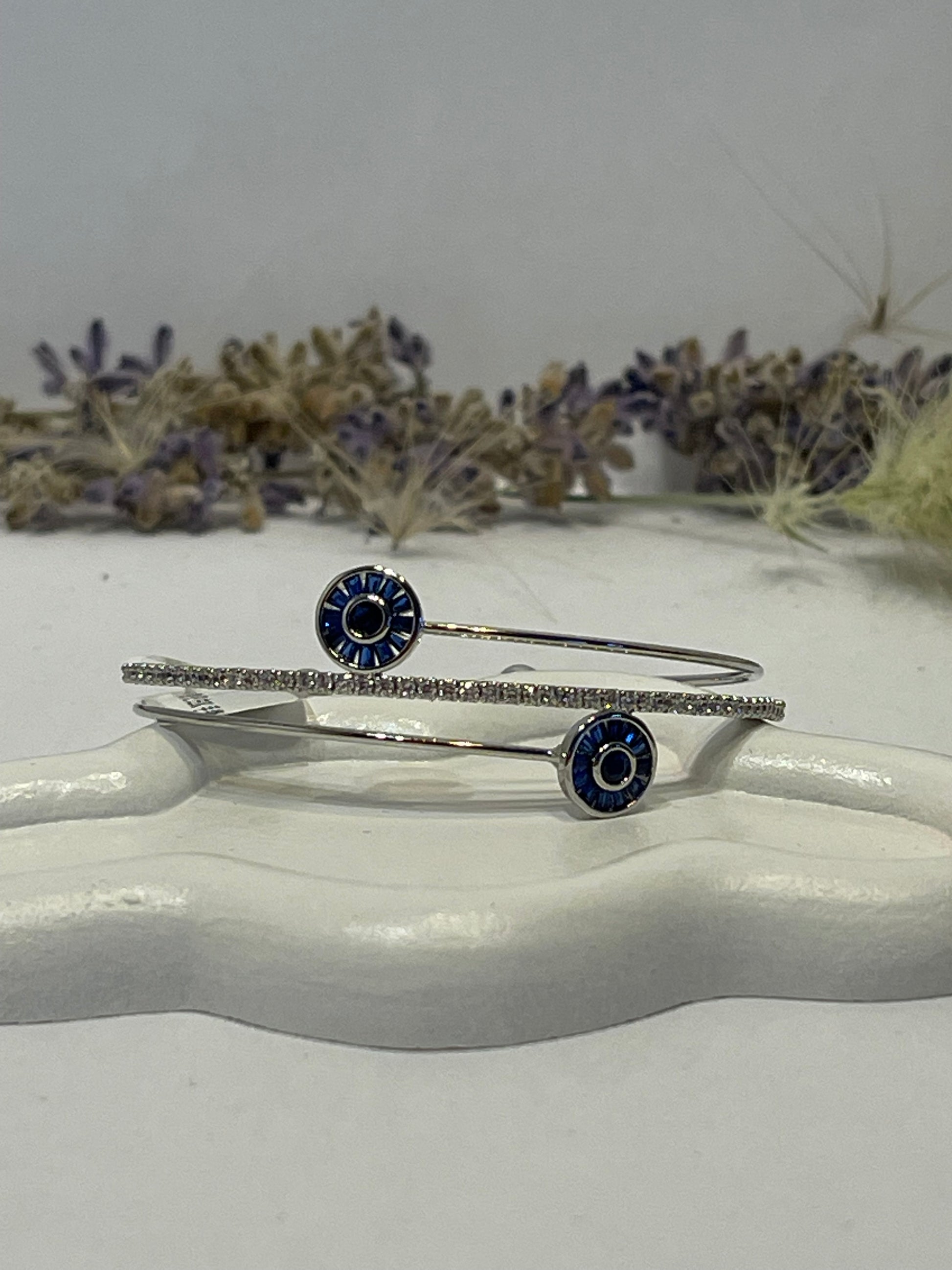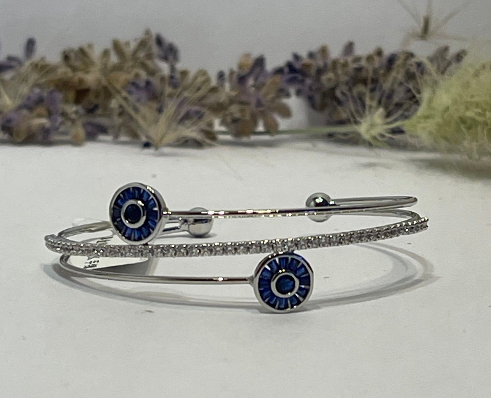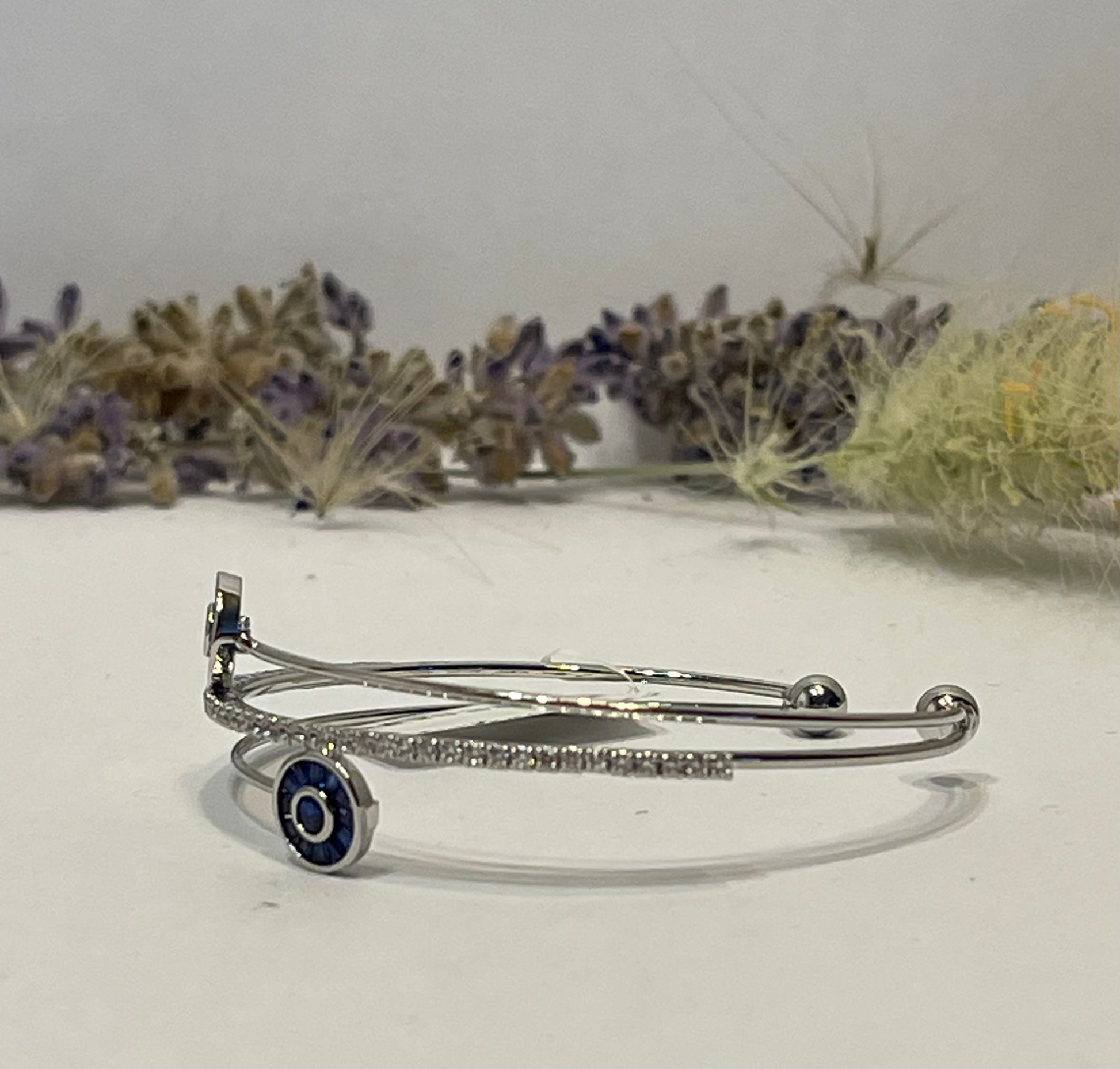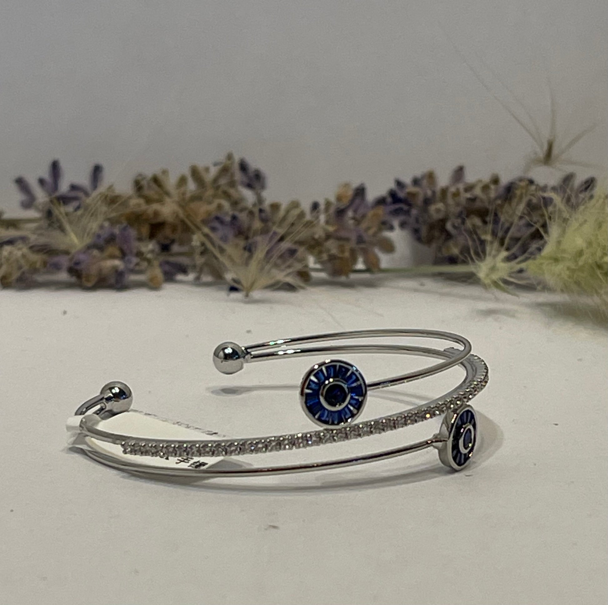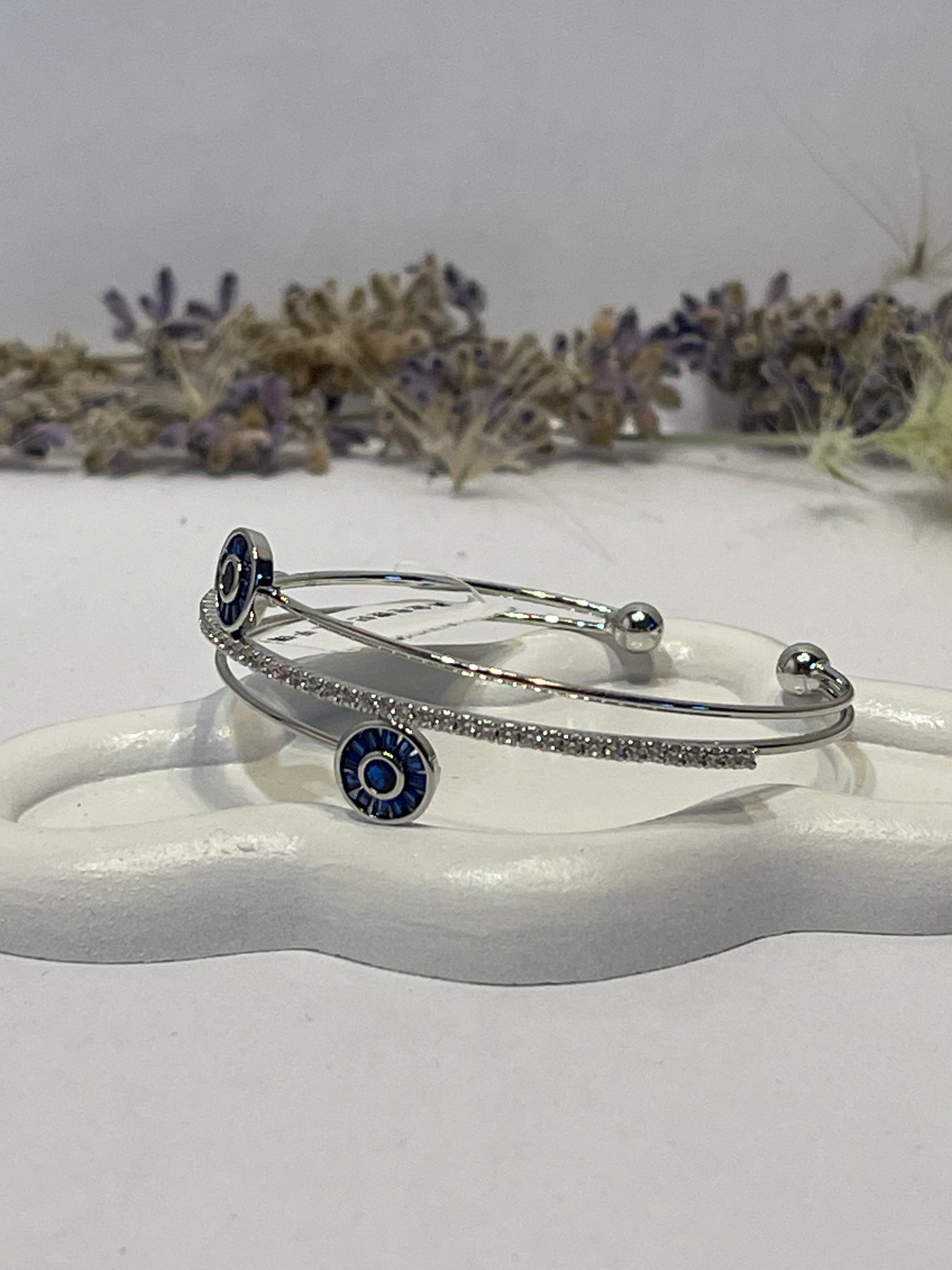 "Delicate and simple silver bracelet adorned with sparkling zircon stones and blue eye-shaped stones. Elegant and perfect for everyday wear, it adds a stylish touch to any outfit."
