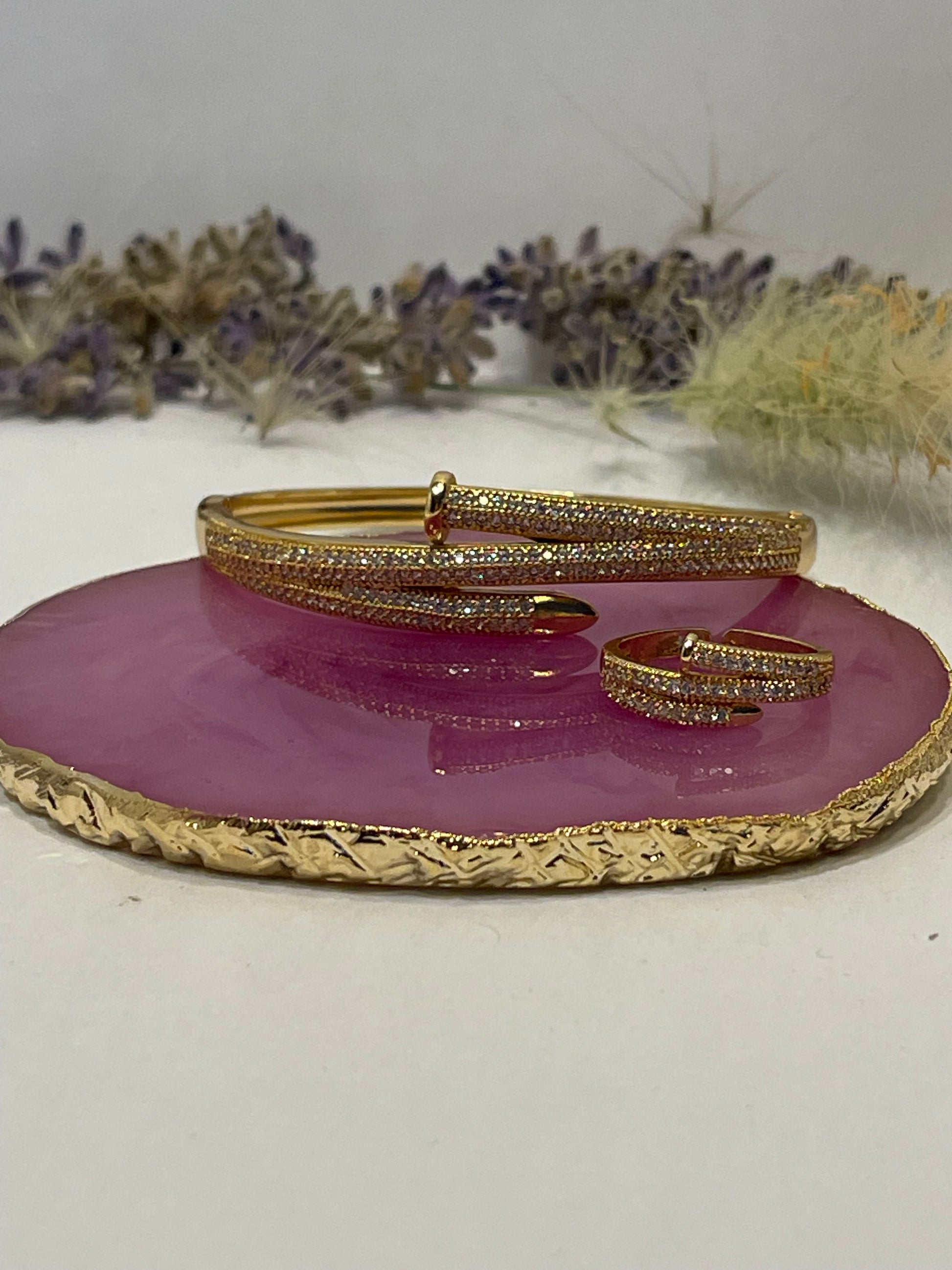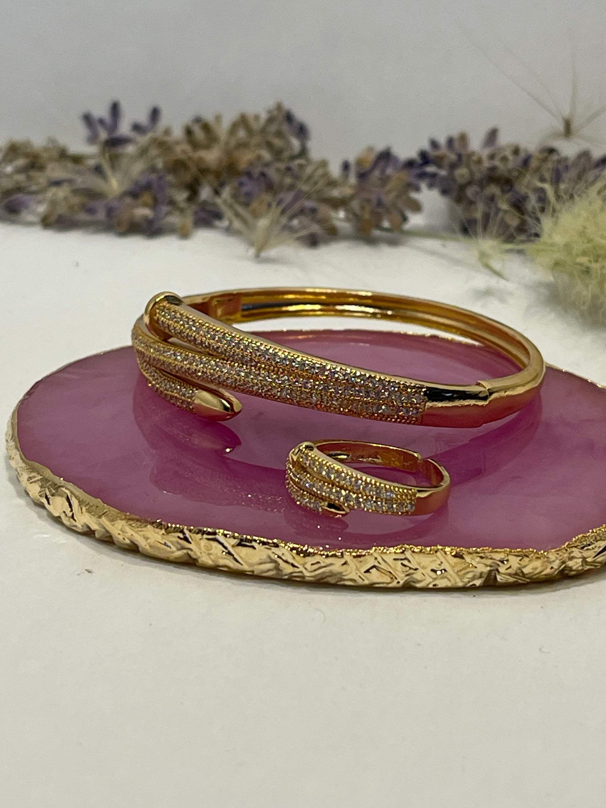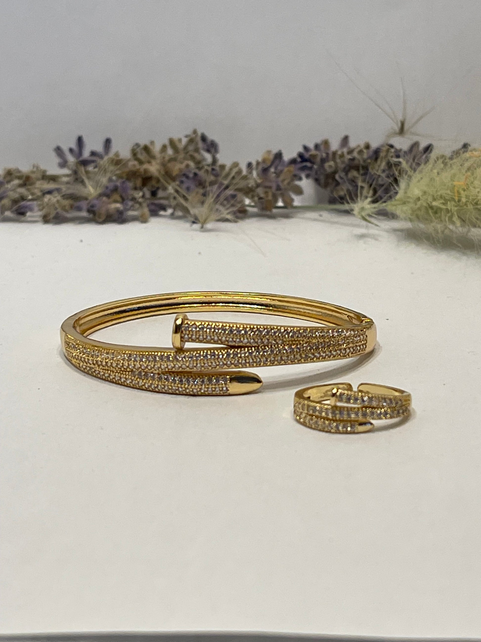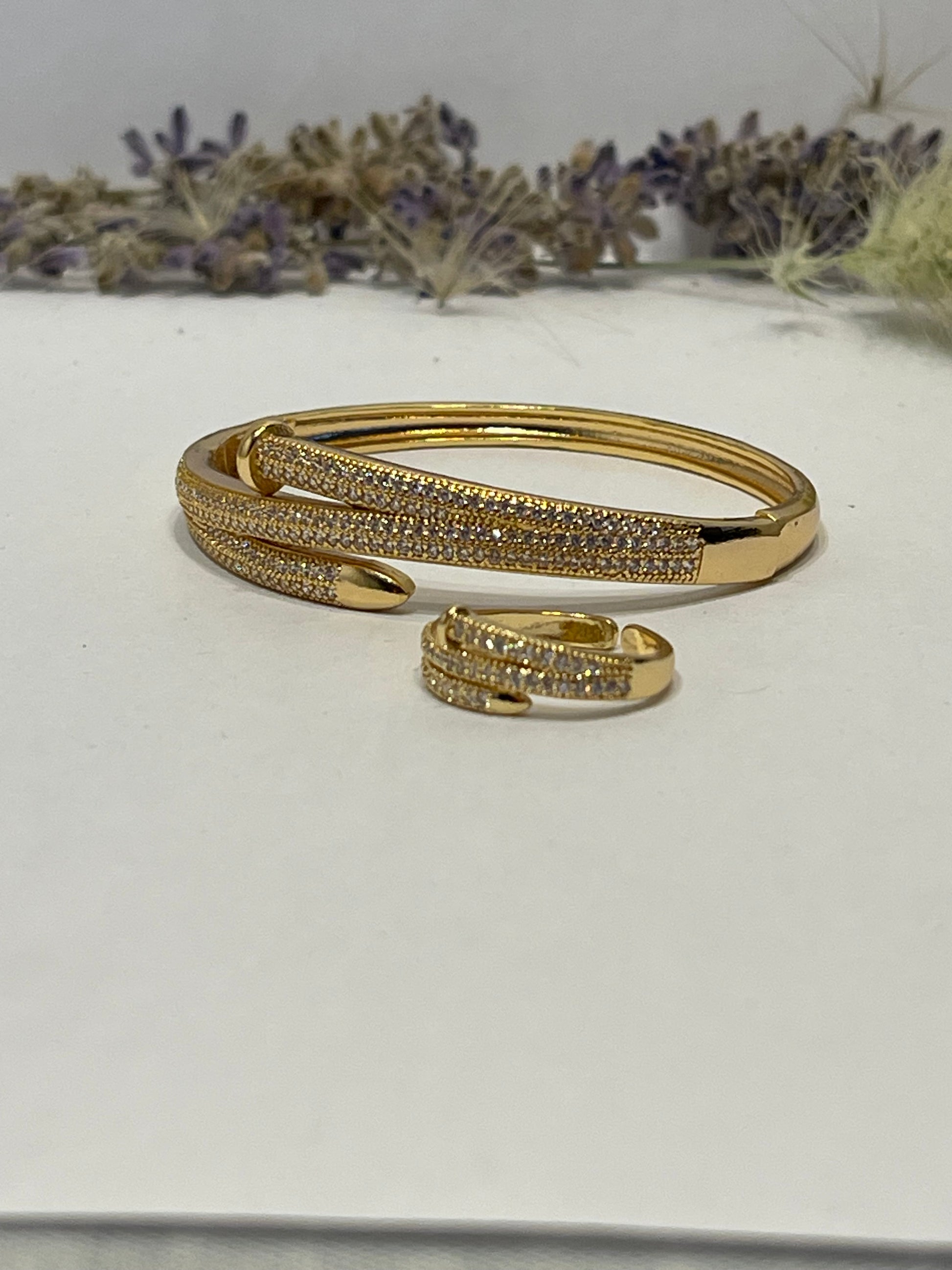 "Set of gold bracelet and ring adorned with sparkling rhinestones. A luxurious and elegant piece made of stainless steel that won’t change color, adding distinction and originality to your look."
