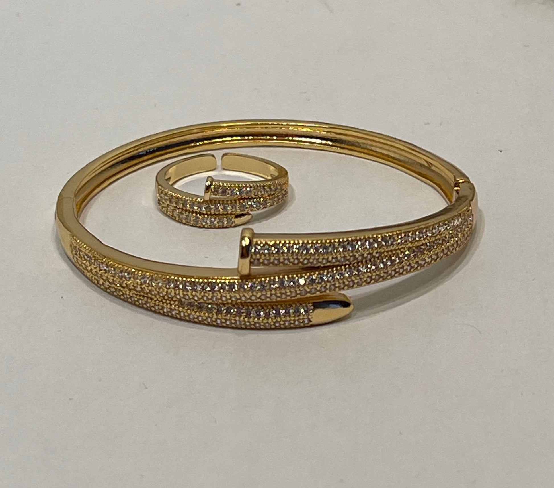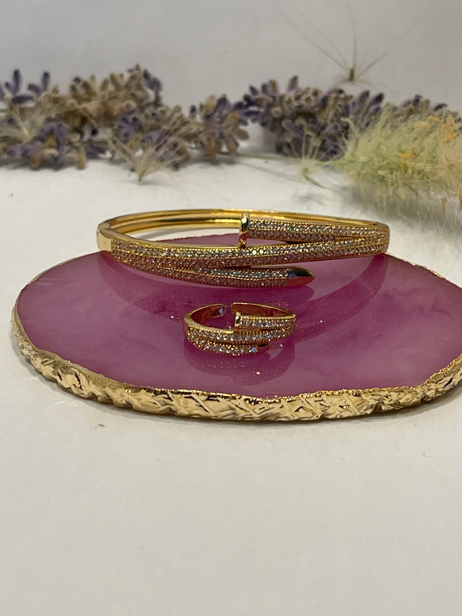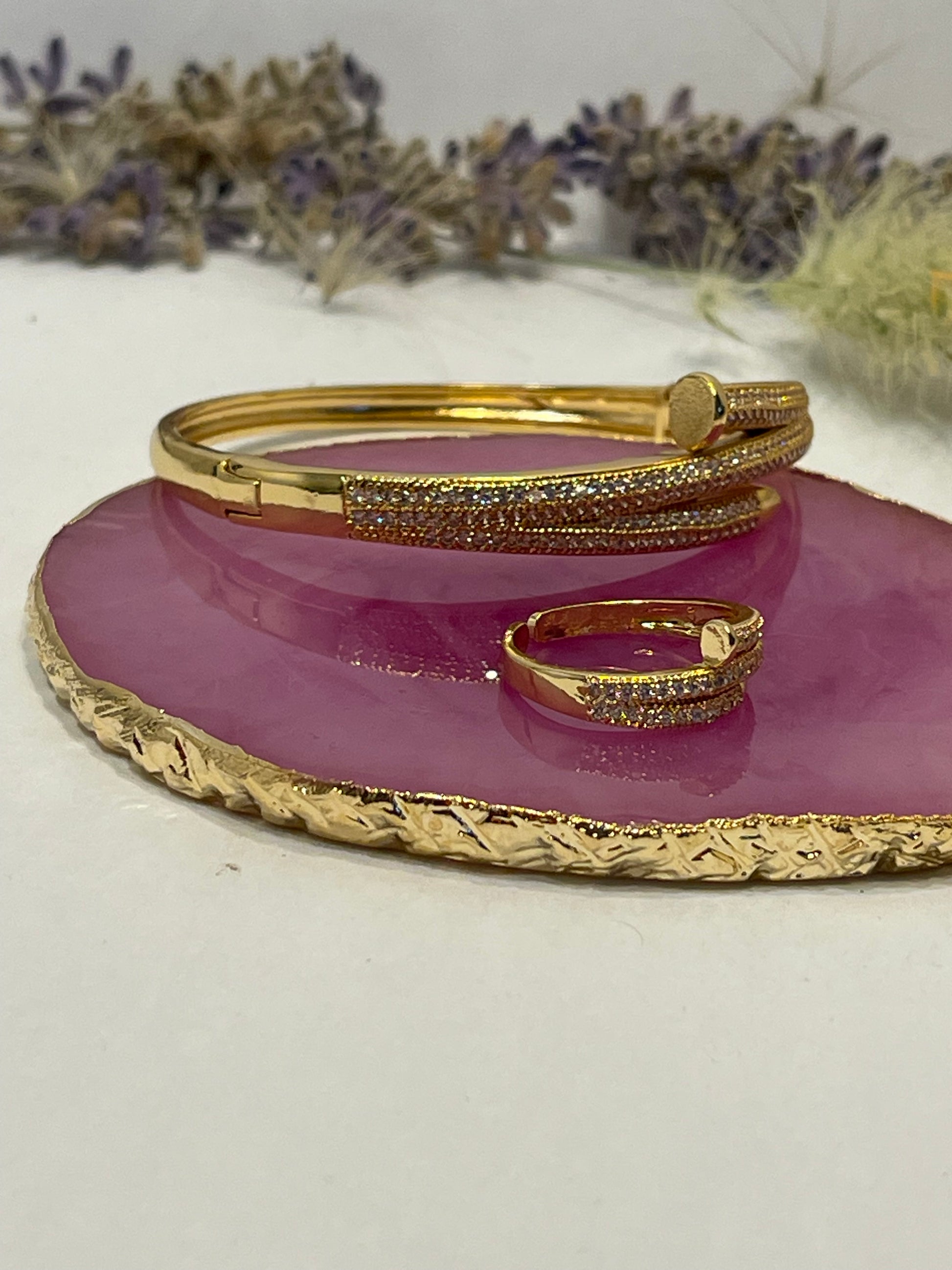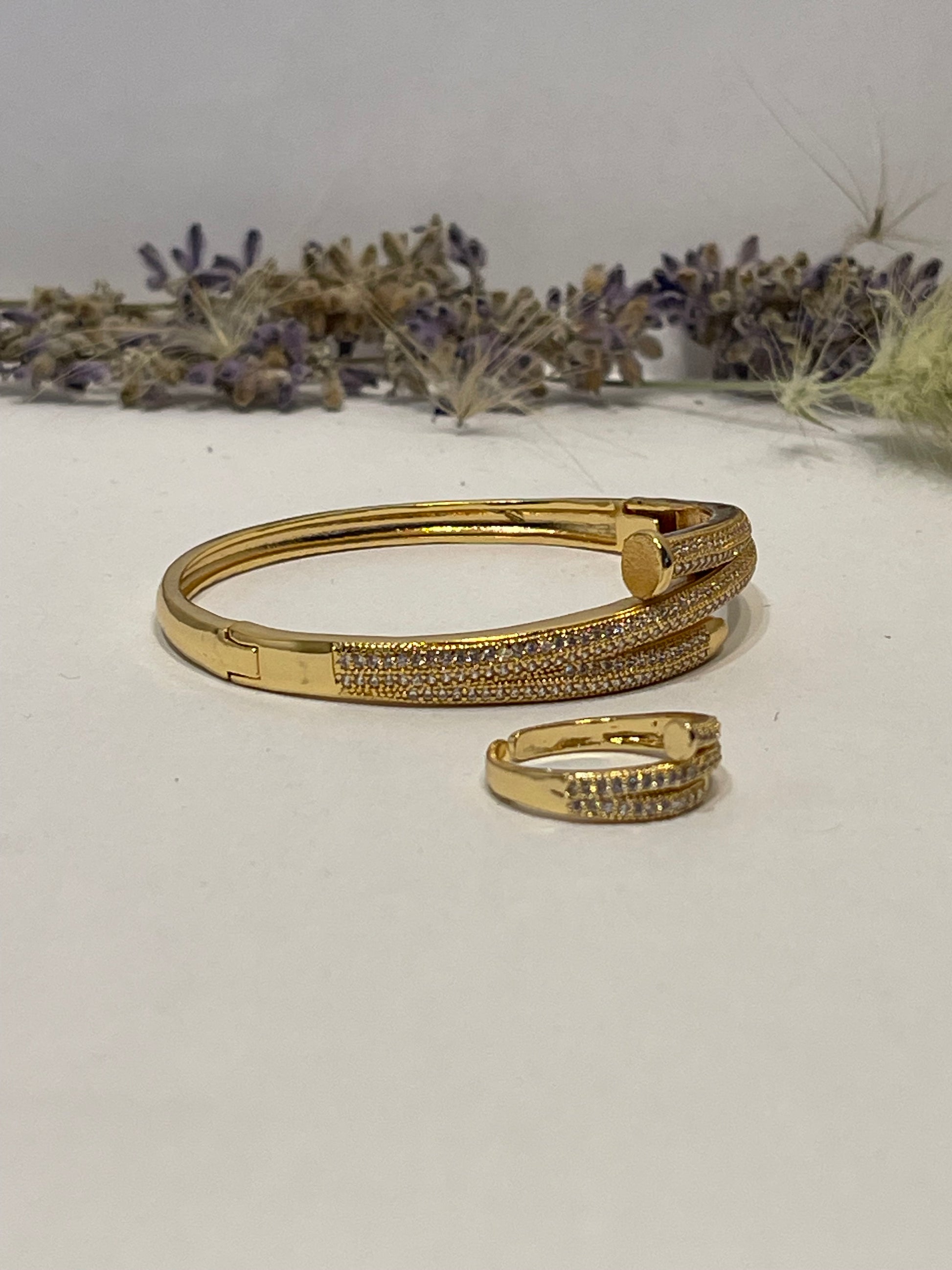 "Set of gold bracelet and ring adorned with sparkling rhinestones. A luxurious and elegant piece made of stainless steel that won’t change color, adding distinction and originality to your look."